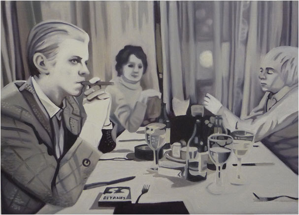 One of the great unsung heroes of rock history is Corinne “Coco” Schwab. Coco has been David Bowie’s personal assistant since 1973, after answering an ad in the Evening Standard in London looking for a “Girl Friday”. She is still his assistant and great friend, having seen him through every phase of his adult life. I have made paintings of every photo I could find of the elusive Coco, along with paintings of the other great secretaries and assistants of pop culture, and also cast myself in two supporting roles familiar to sci-fi fans.