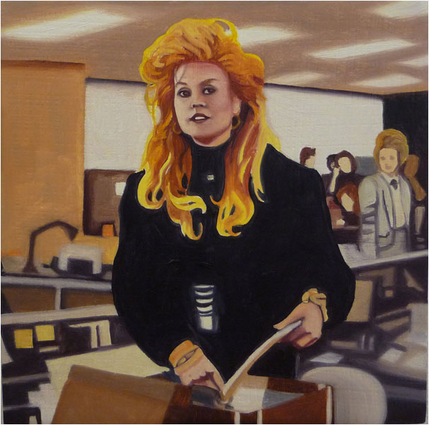 One of the great unsung heroes of rock history is Corinne “Coco” Schwab. Coco has been David Bowie’s personal assistant since 1973, after answering an ad in the Evening Standard in London looking for a “Girl Friday”. She is still his assistant and great friend, having seen him through every phase of his adult life. I have made paintings of every photo I could find of the elusive Coco, along with paintings of the other great secretaries and assistants of pop culture, and also cast myself in two supporting roles familiar to sci-fi fans.